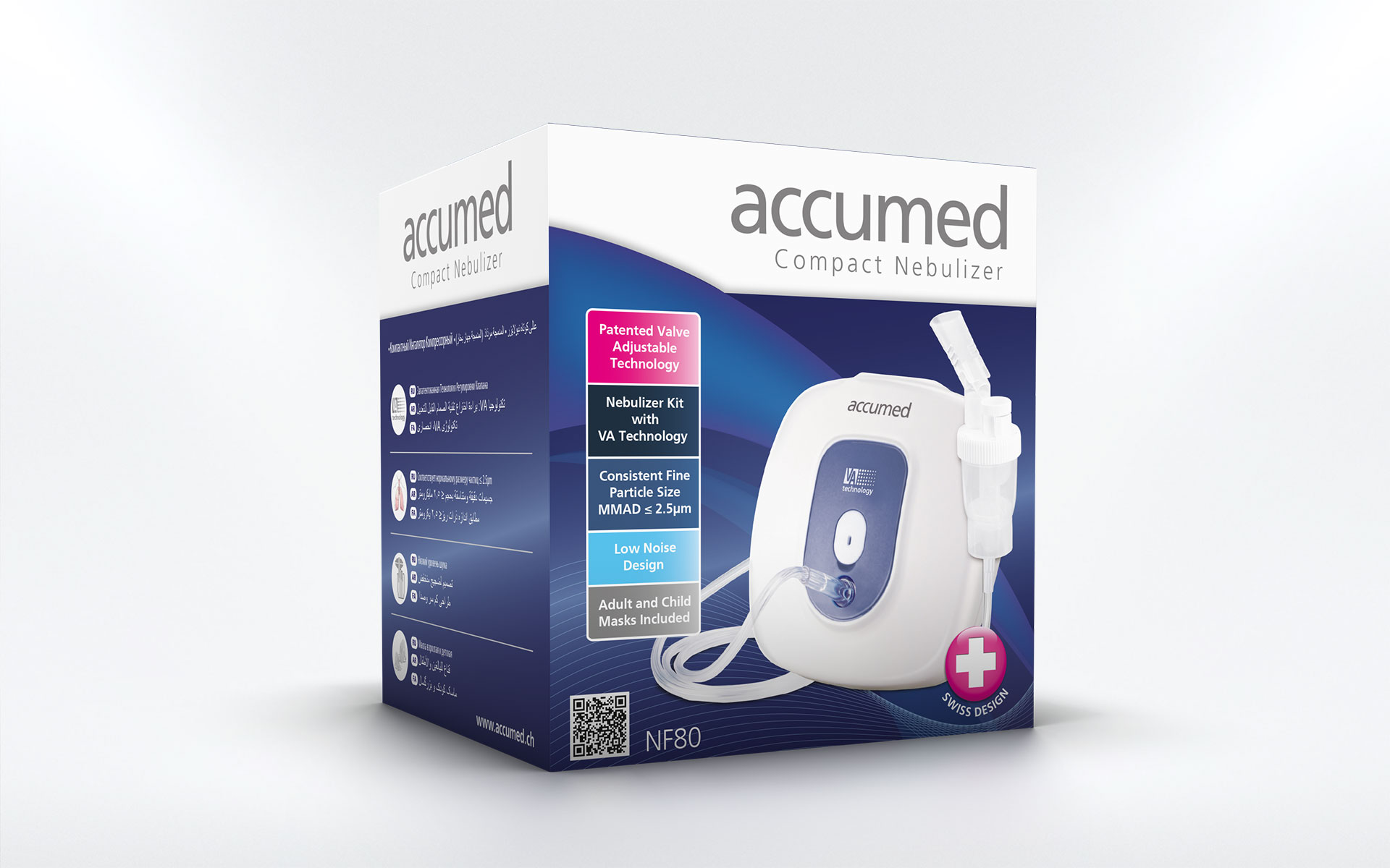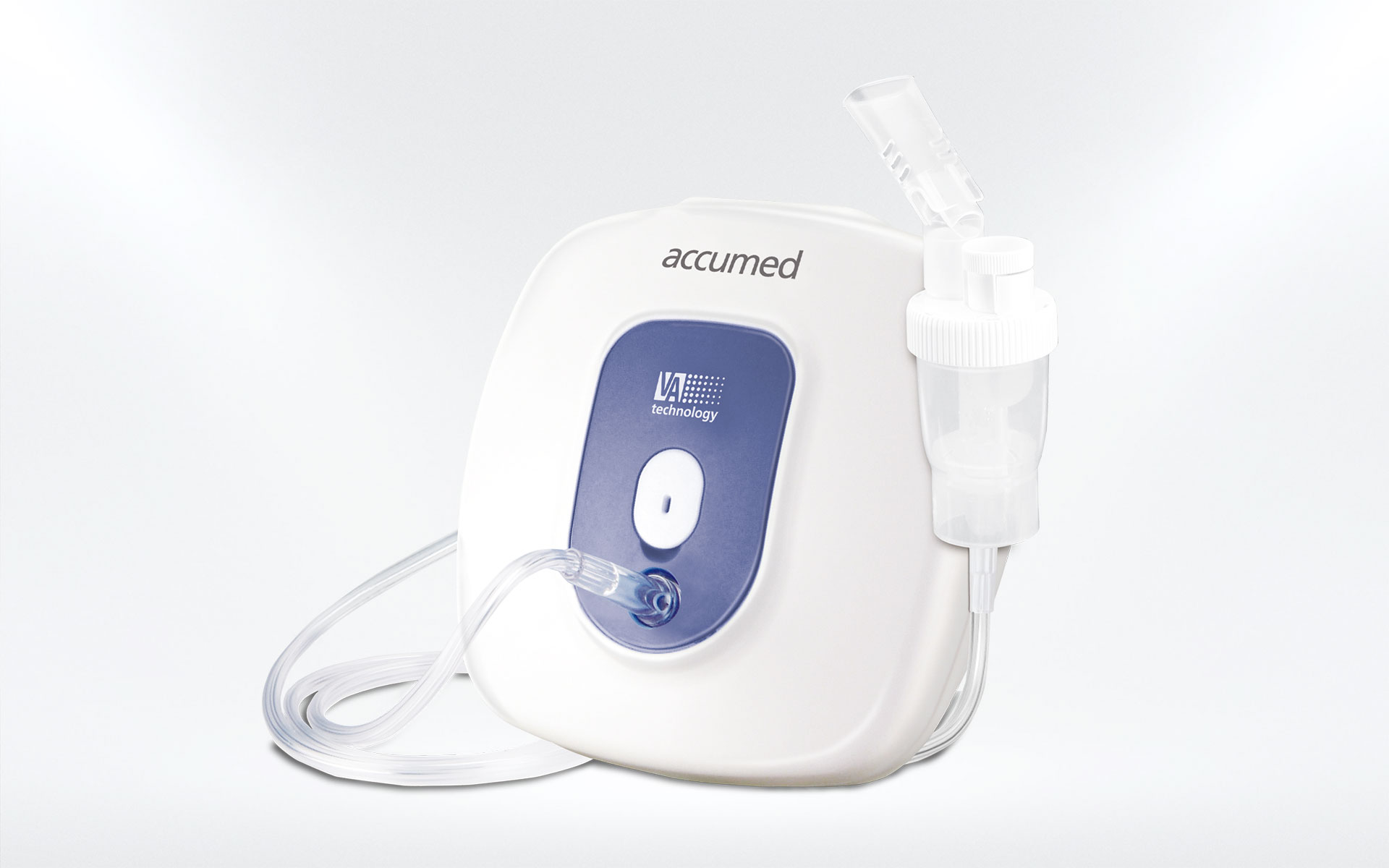 Este nebulizador com tecnologia de ar comprimido é indicado para o tratamento das vias respiratórias superiores e inferiores, gripes, asma e outras doenças respiratórias, sendo adequado para adultos e crianças. Silencioso e fácil de usar e limpar, certificado como dispositivo Médico. A tecnologia VA permite que os utilizadores façam ajustes dos diferentes níveis de taxa de nebulização variando de 0,1 (fechado) a 0,3 ml/min (totalmente aberto), com um tamanho de partícula consistente menor que 2,5 μm. O tamanho de partícula gerado pelo frasco VAT é de cerca de 2,262 μm (MMAD).